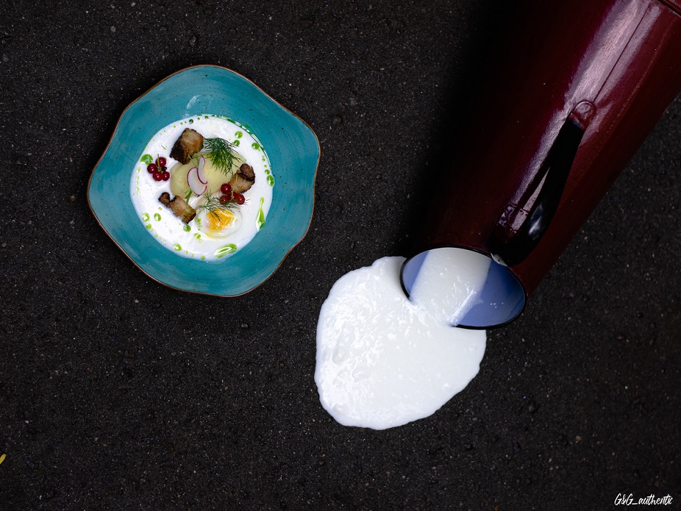 Sposób przygotowania: maślankę mieszamy z chrzanem, doprawiamy pieprzem i cukrem, wszystko razem mieszamy. Odstawiamy do lodówki do schłodzenia. Ziemniaki gotujemy w wodzie ze szczyptą soli. Ugotowane i przestudzone przeciskamy przez praskę i łączymy z masłem o temperaturze pokojowej. Jajka wstawiamy do rondla, zalewamy wodą i gotujemy dokładnie 6 minut, po tym czasie wyjmujemy je i wstawiamy od razu do lodowatej wody. Po chwili obieramy. Boczek kroimy w większą kostkę i obsmażamy na patelni na złoty kolor. Na puszystych ziemniakach układamy porcje boczku, stawiamy obrane jajko, ścinamy jego wierzchołek, dzięki czemu żółtko ładnie rozleje się po ziemniaku, zalewamy zimną maślanką, posypujemy aromatycznym koperkiem.