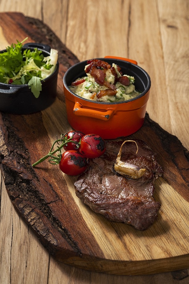 Sposób przygotowania: ziemniaki myjemy i pieczemy w ognisku bądź na grillu aż uzyskają czarną łupinkę. Po upieczeniu wyciągamy z ich środka miąższ, przekładamy do miski, dodajemy ciepłe masło z mlekiem, następnie skwarki z boczku, posiekaną pietruszkę i całość doprawiamy solą oraz pieprzem. Ubijamy do uzyskania kremowego puree. Steki doprawiamy solą i pieprzem, smarujemy olejem. Smażymy na dobrze rozgrzanej patelni po ok. 1,5 minuty z każdej strony, umieszczamy gałązki rozmarynu i zgniecione ząbki czosnku, dodajemy masło i smażymy po 1/2 minuty z każdej strony, a następnie steki odkładamy w ciepłe miejsce na ok. 5 minut. W tym czasie przygotowujemy sałatkę: dokładnie myjemy i osuszamy mix sałat, dodajemy pociętą w piórka cebulę. Z oleju, octu, musztardy i przypraw robimy sos vinegrette. Skrapiamy nim sałatę. Steka podajemy z puree, sałatką i grillowanymi pomidorkami.